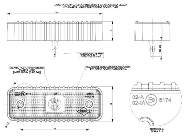 Poniżej znajdziesz szczegółowe informacje dotyczące lampy obrysowej LD 537, która posiada podkładkę gumową ryflowaną, diody LED, odblask oraz funkcję światła pozycyjnego przedniego.